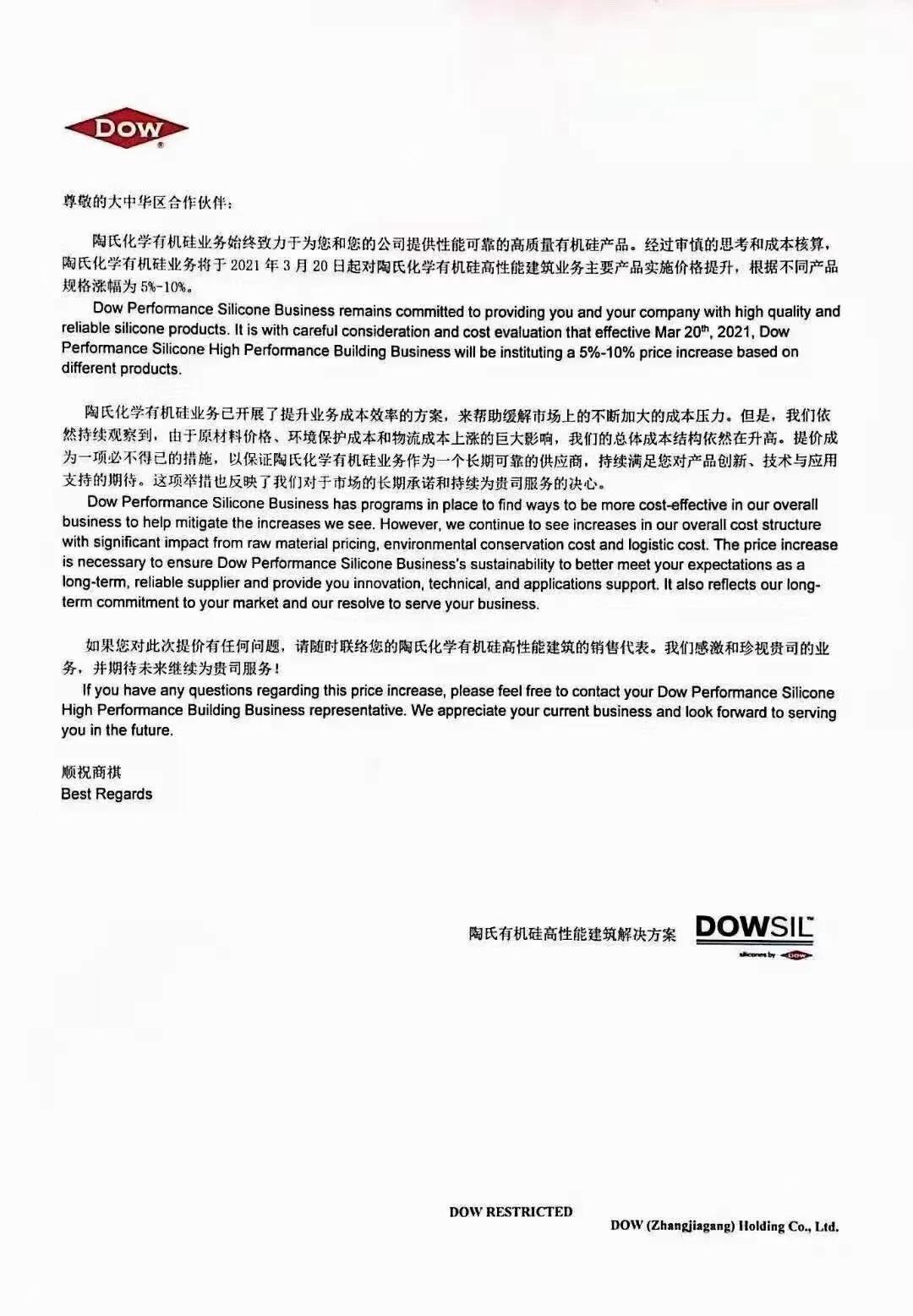 有機(jī)硅業(yè)務(wù)宣布,自3月20號(hào)起將上調(diào)有機(jī)硅高性能建筑業(yè)務(wù)領(lǐng)域產(chǎn)品價(jià)格,,此次漲價(jià)的主要原因是近期全球原料瘋漲,以及環(huán)境成本和物流成本的上漲。0gd膩?zhàn)幽z粉_可再分散乳膠粉_羥丙基甲基纖維素_聚丙烯纖維_木質(zhì)纖維素_北京萬(wàn)圖明科技有限公司