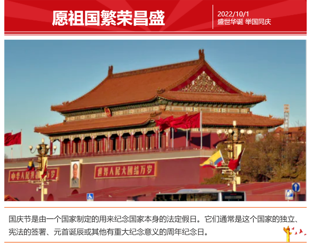 放假安排: 根據(jù)《國(guó)務(wù)院辦公廳關(guān)于2022年部分節(jié)假日安排的通知》,國(guó)慶節(jié)10月1日至7日放假調(diào)休,共7天。