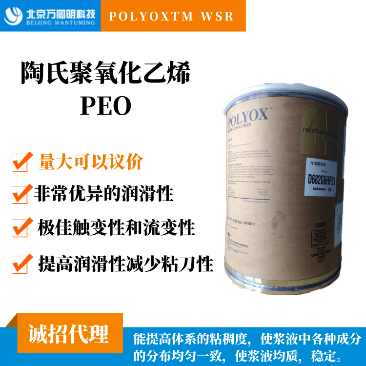 POLYOXTM WSR 308聚氧化乙烯PEO用做水泥添加劑,能提高體系的粘稠度,使?jié){液中各種成分的分布均勻一致,使?jié){液均質(zhì)、穩(wěn)定,并防止?jié){液產(chǎn)生沉降分層和泌水,提高了保水率,保水性能。